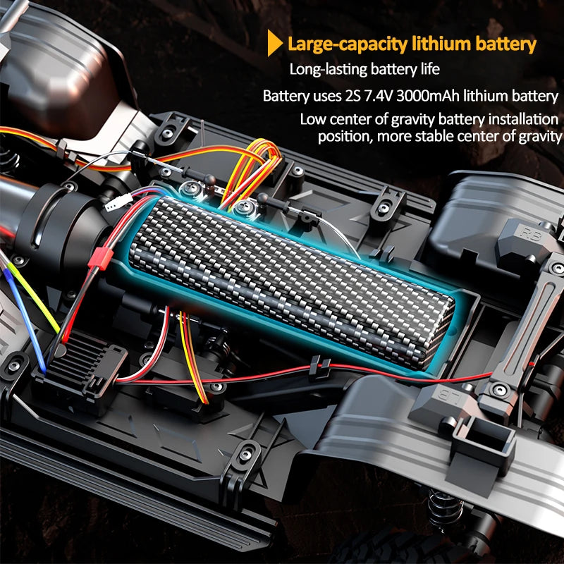 This rig is a beast. The metal chassis and suspension soak up rough terrain, and the tires grip everything. I’ve run it through water, dirt, and gravel—no issues. It’s heavy, durable, and has a ton of power right out of the box. Great RTR setup.