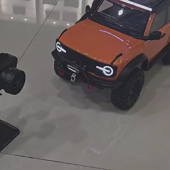 The entire vehicle is equipped with synchronized lighting, including headlights, turn signals, and roof light bar with 17 effects for immersive night crawling.