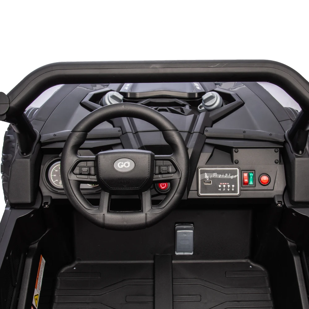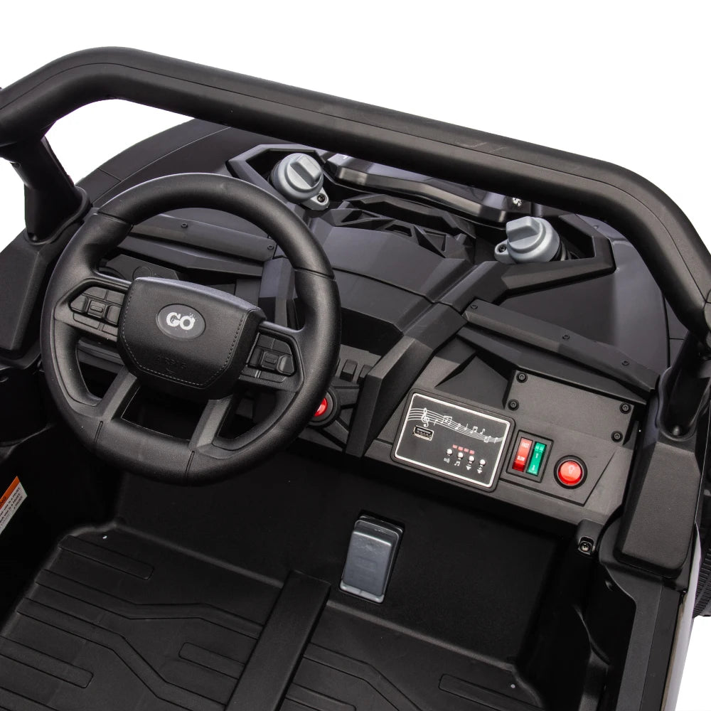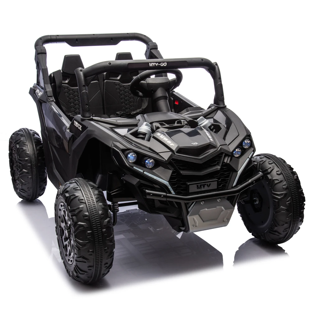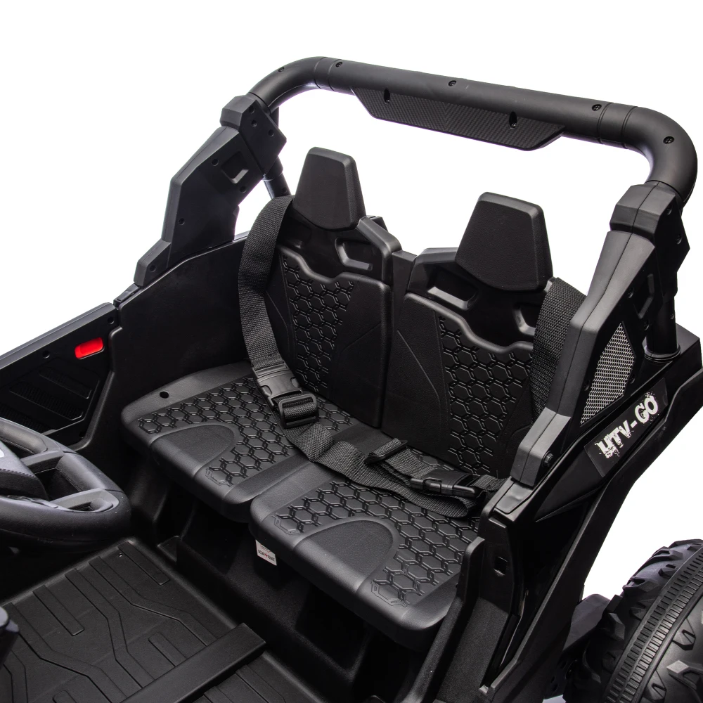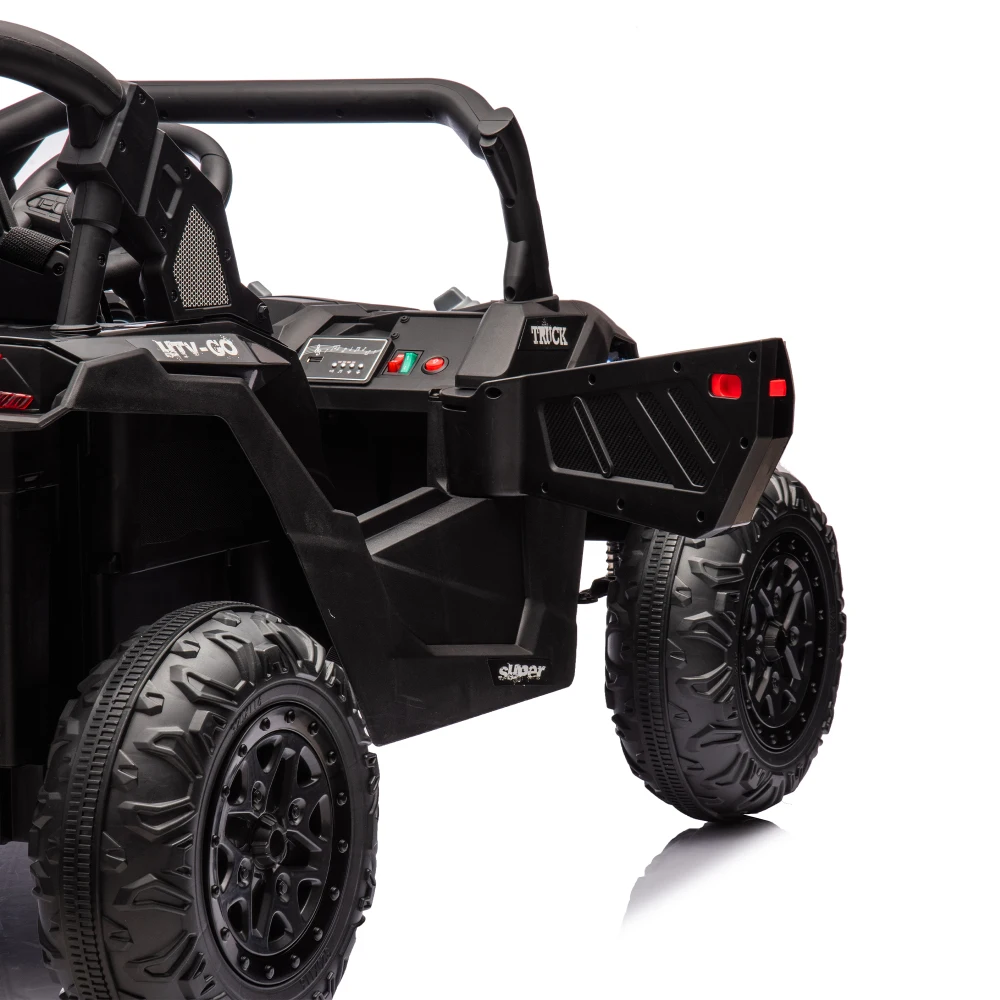 This 24V Two-Seater Ride-On UTV is built for big fun, safe play, and off-road-style exploration. With a powerful 24V battery, real dual seating, and remote parental control, it delivers a fun and secure driving experience for kids aged 3 and up. The oversized tires, four-wheel suspension, and front anti-collision bar give it serious terrain-handling power, while multimedia features like built-in music and volume control keep the adventure exciting.
