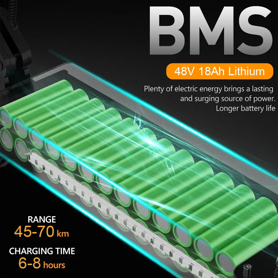 Ride up to 80km (50 miles) on a single charge, with BMS protection and a 5-year rated battery life. -