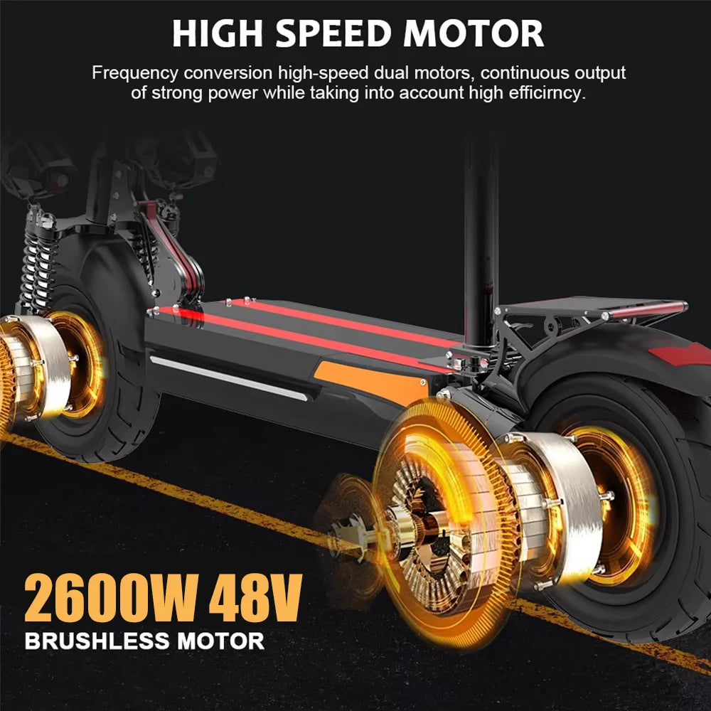 Experience unbeatable performance and versatility with the 2600W Dual Drive Electric Scooter, engineered for powerful commuting and adventurous rides alike. Equipped with dual 1300W brushless motors (total 2600W), this scooter reaches speeds of up to 65km/h (40mph), providing rapid acceleration and strong torque for tackling steep inclines up to 35°. Whether you're navigating city streets or exploring rough terrain, this electric scooter is built to keep up.