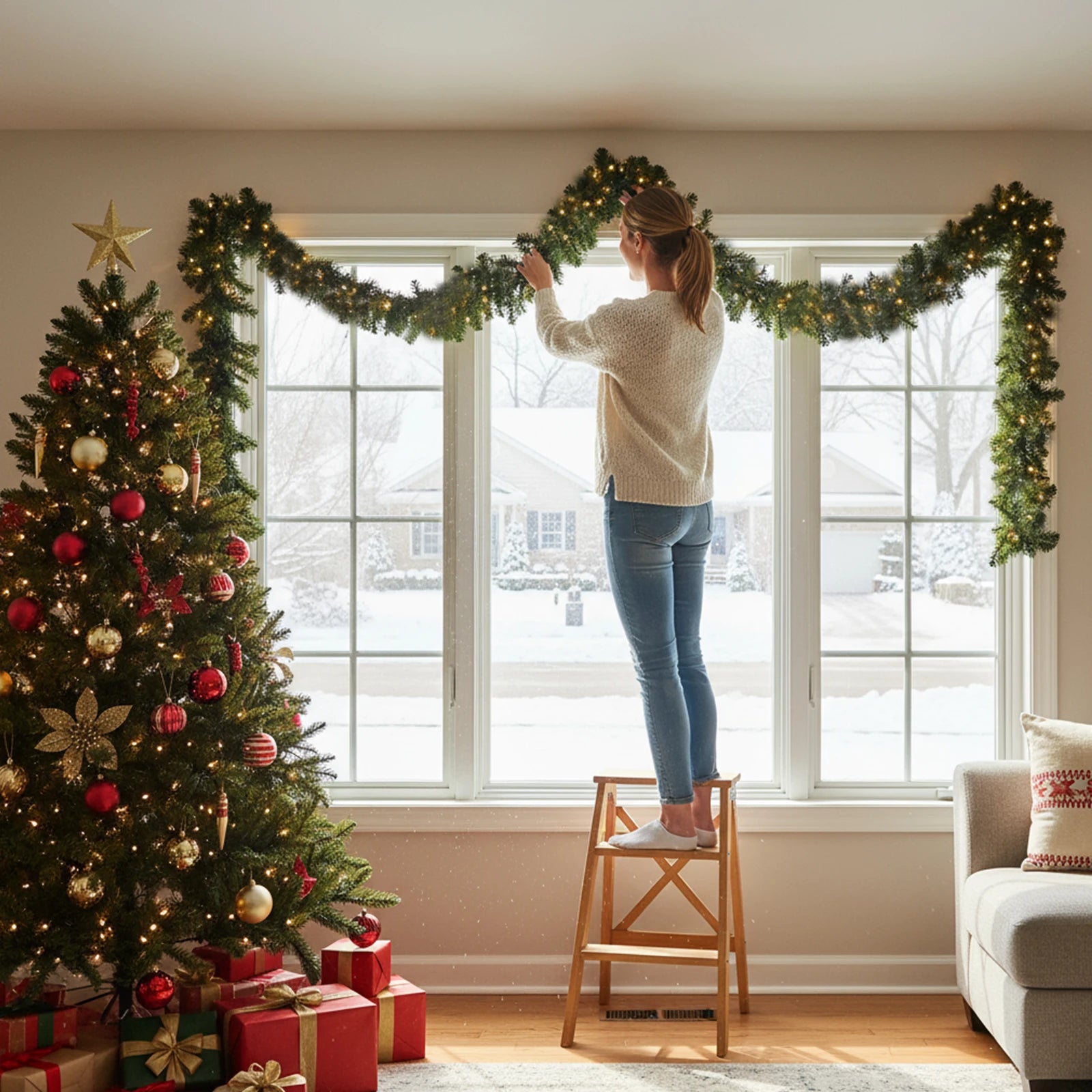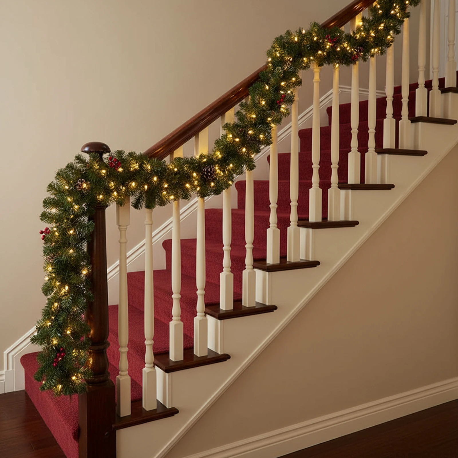 Features: 1.Festive Atmosphere: Equipped with 50 gentle LED lights, this christmas garland brings a warm and romantic ambiance to your home, making every celebration space glow with a welcoming holiday spirit. 2.Versatile Decoration: Ideal for fireplaces, stair railings, front doors, or christmas wreath arrangements, it easily creates the ideal festive look for multiple scenarios and adds charm wherever you display it. 3.Safe & Efficient LED Lighting: Featuring low-consumption bulbs, these decorations wreath illuminate evenly, remain cool to the touch, and provide long-lasting, safe lighting suitable for families and public spaces. 4.Simple Installation & Removal: Designed for convenience, the artificial christmas wreaths comes with hooks or ties so you can quickly set up or take down without complicated tools, saving time and effort. 5.Premium Weather-Resistant Material: Made from high-quality, sturdy components, this xmas faux wreaths withstands wind and rain, ensuring your indoor or outdoor decor remains vibrant throughout the festive season. Specification: Product size: 350.00x250.00x120.00mm