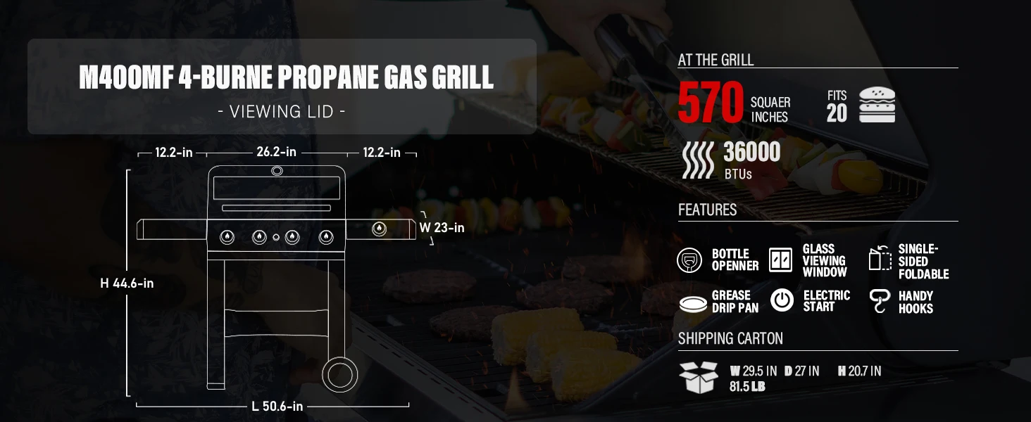 Upgrade your outdoor cooking experience with the Mesa 400MF 4-Burner Gas Grill by Monument Grills. Designed for performance, durability, and style, this propane grill features four stainless steel burners, an impressive 570 sq. in. cooking space, and a sleek viewing lid that lets you check on your food without lifting the hood. Whether you're grilling burgers for the whole block or slow-cooking ribs for your family, the Mesa 400MF delivers every time.