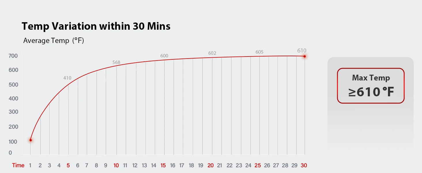 Quick Preheat Time – Reaches 500°F in just 10 minutes, with a max heat of over 610°F.