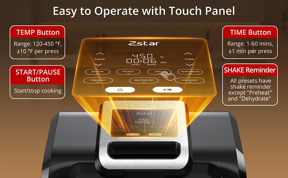 🕹️ Easy Touch Panel: Intuitive controls with shake reminders, timer (1–60 mins), and temperature adjustment (120–450°F) by increments.