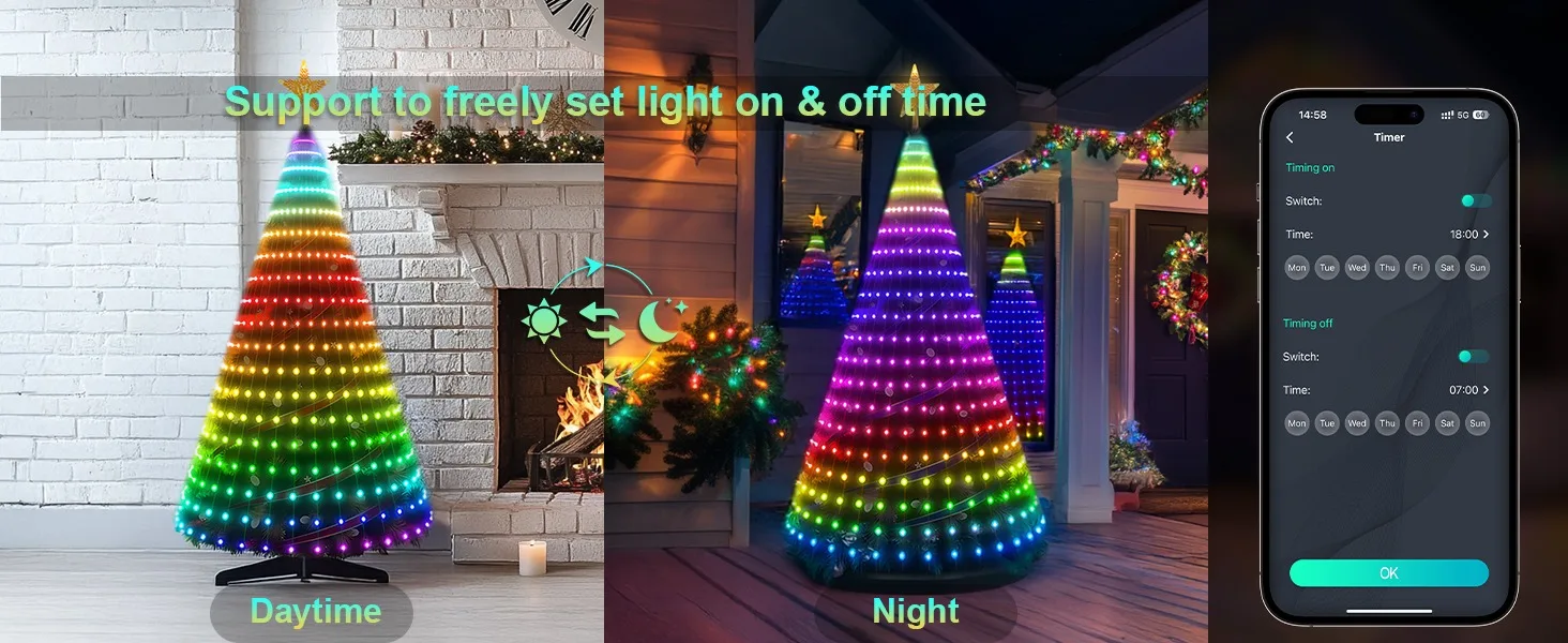 The microphone can read music from the phone and capture external sounds, with 6 music modes available. You can set the specific time for the light string to ON/OFF, and the controller will save your last mode setting without the need to reset the mode every time.