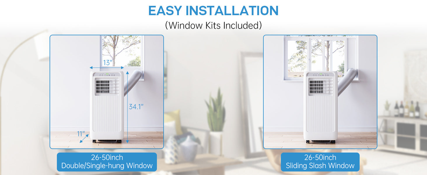 Designed for convenience, this compact and portable AC unit comes with built-in wheels and side handles, making it easy to move from room to room. Installation is quick and simple, with all necessary accessories included for a hassle-free setup. Enjoy a cool and refreshing home with this efficient and easy-to-use air conditioning solution!