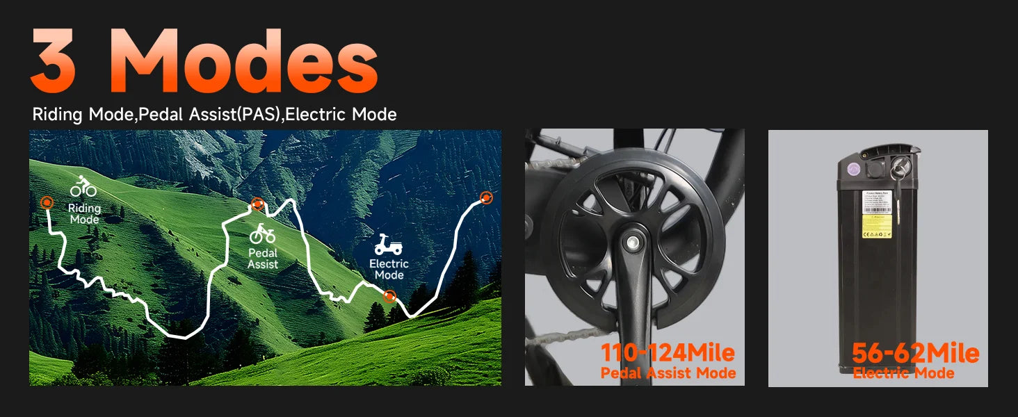 Long Range Riding: Up to 100 km on pure electric, 200 km with pedal assist.