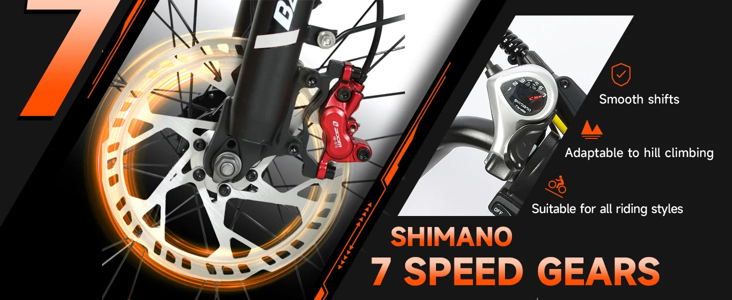 7-Speed Gear System: Shimano-style shifting gives you control and efficiency across all terrain types.