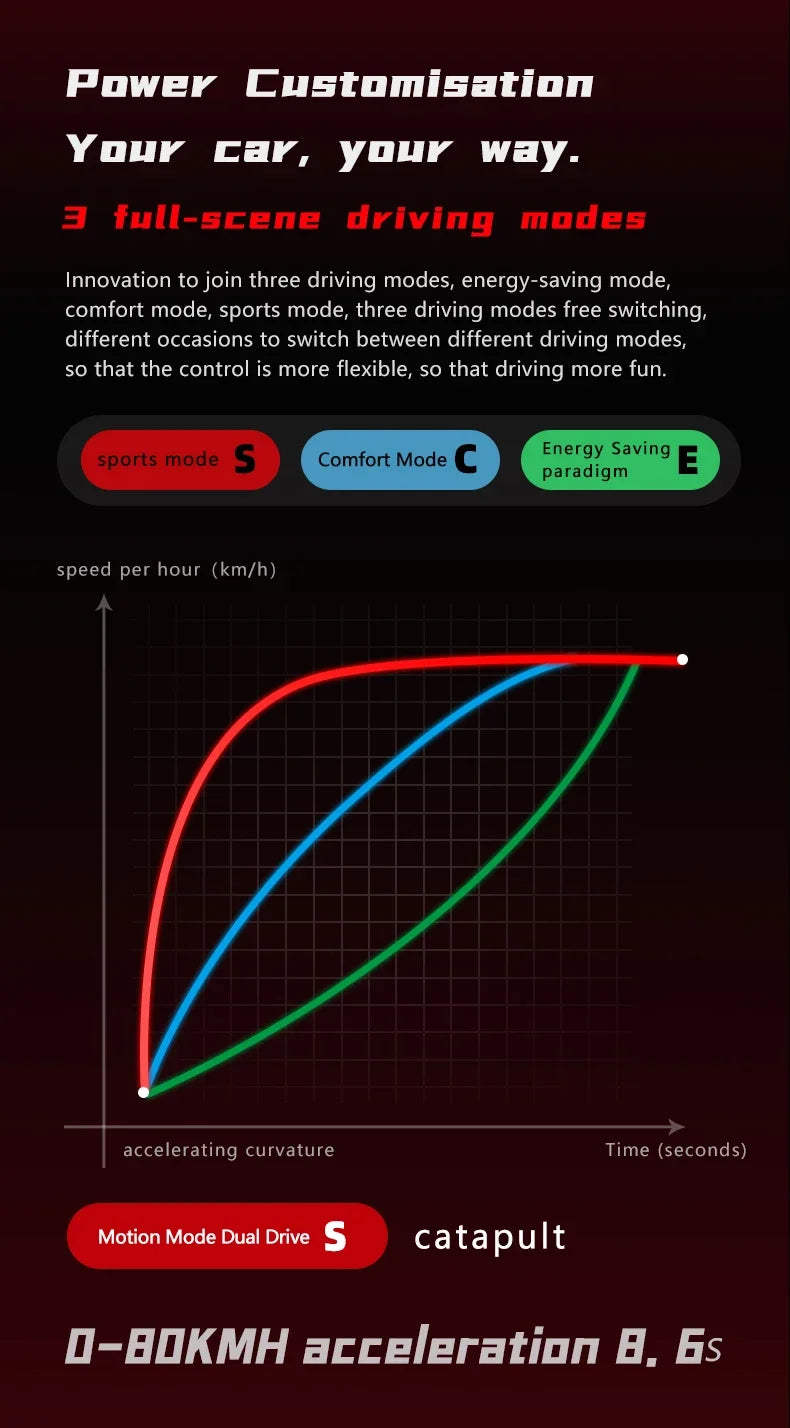 - Drive Modes: Front motor only, rear motor only, or dual drive (2WD)