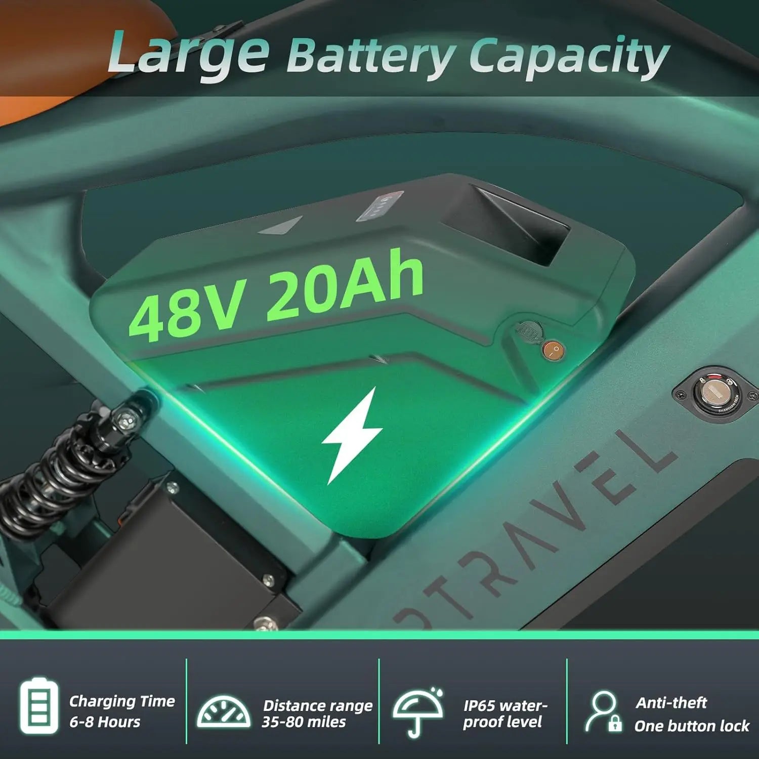 - Battery: 48V 25Ah Samsung/LG UL-certified lithium battery (removable)