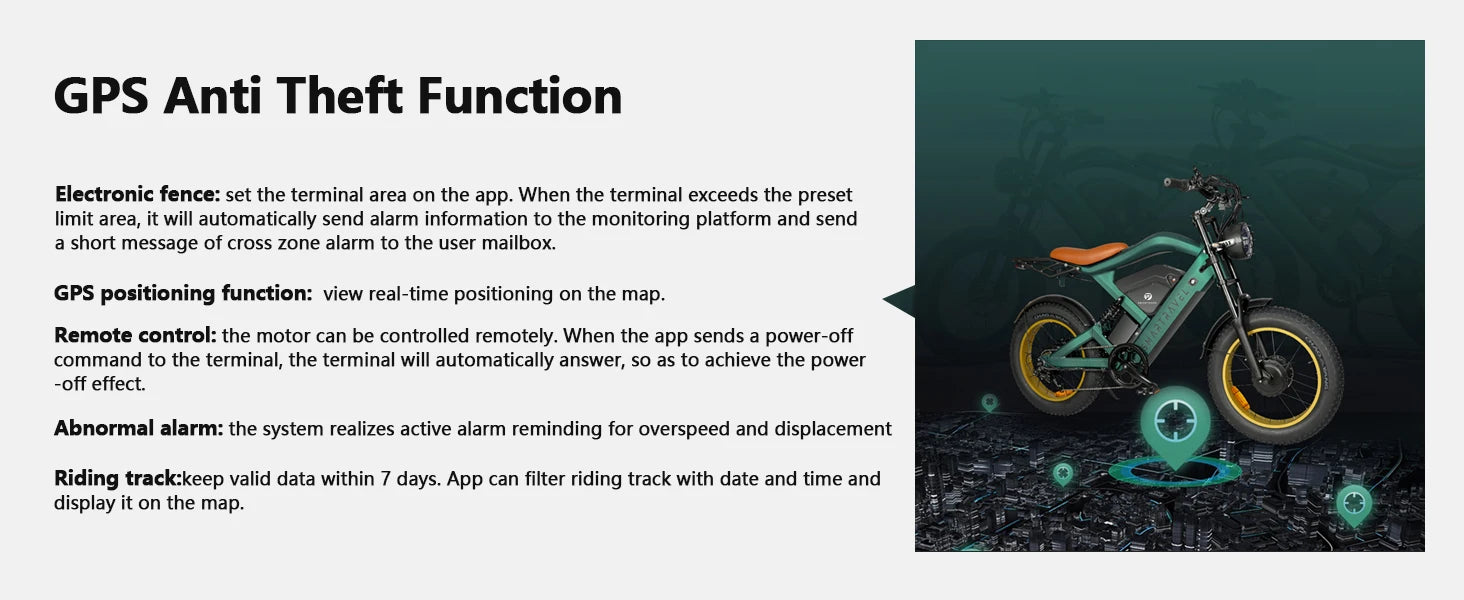Access GPS tracking, ride stats, remote motor control, alarm functions, geo-fencing, and more via Bluetooth-connected app. -