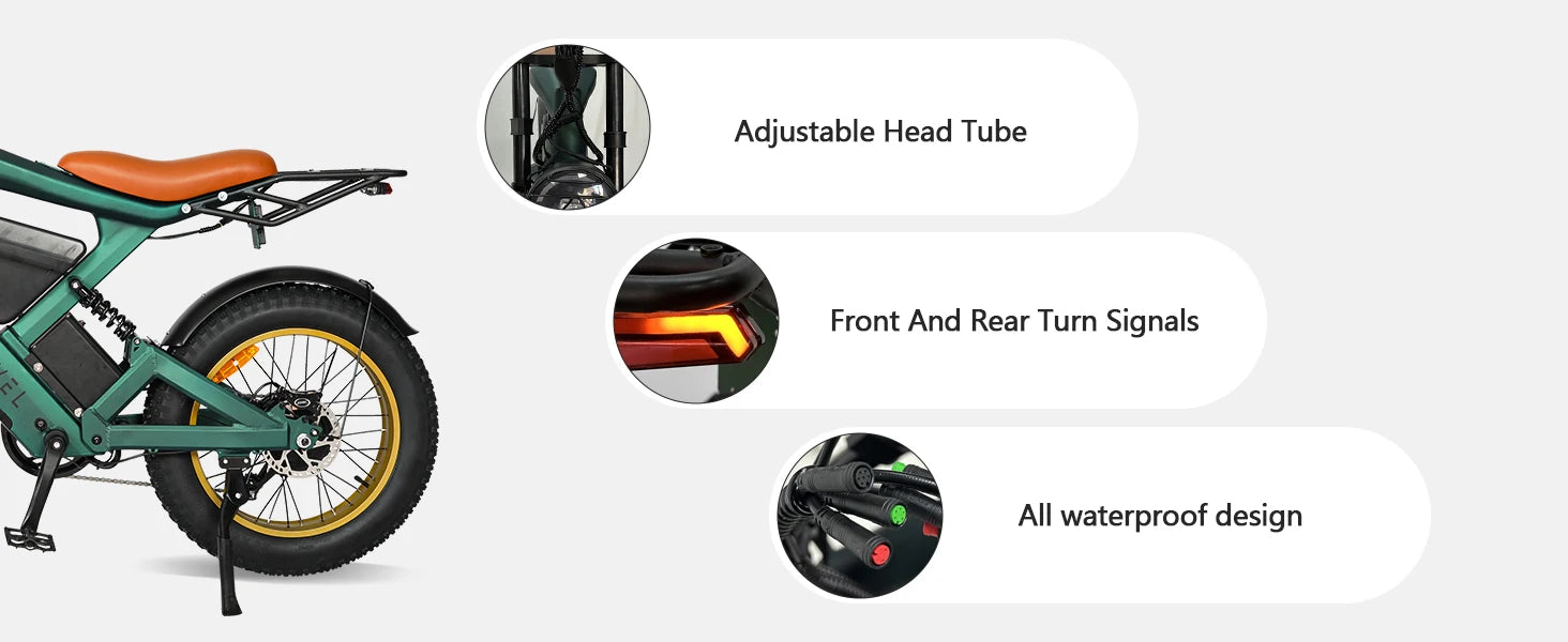 Built on a 6061 aluminum alloy frame, this ebike supports riders between 5'1" and 6'3" and a maximum load of 330 lbs. Ideal for commuting, trail riding, and leisure exploring, it’s a fusion of technology, comfort, and aggressive style made for modern mobility.