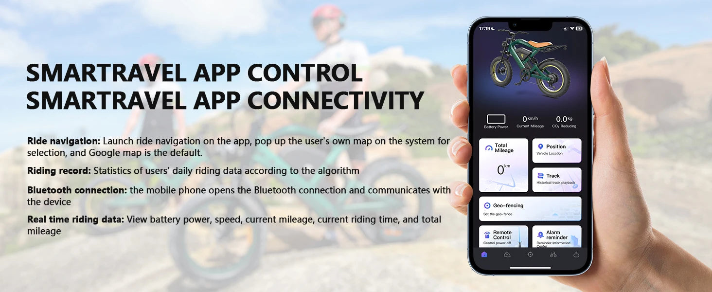 Take control of your ride like never before using the Smartravel mobile app. From ride navigation and Bluetooth pairing to GPS-based electronic fencing and remote motor shutdown, the app offers high-level interactivity. You can track mileage, set ride boundaries, activate alarms, and monitor your ride in real-time — all from your smartphone.