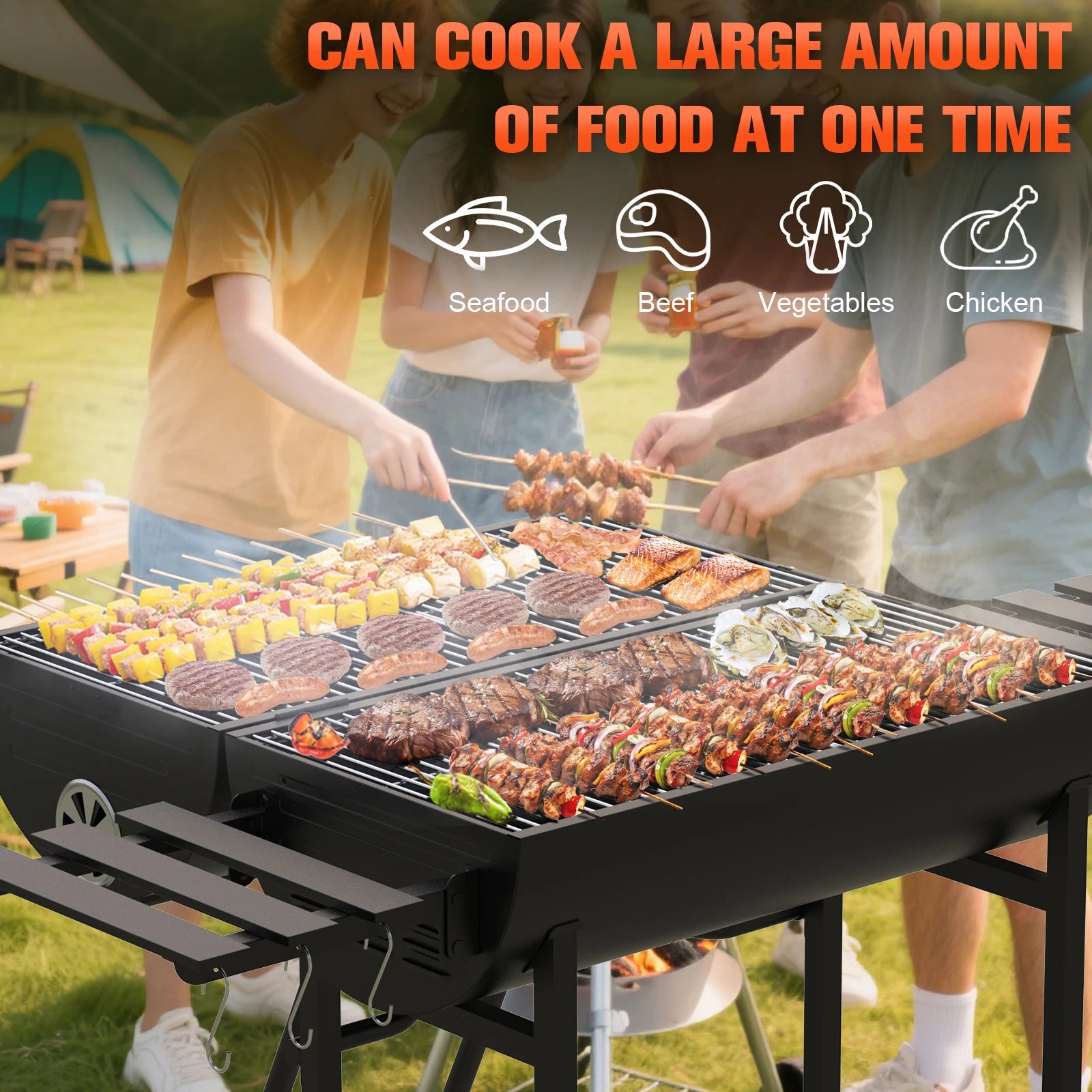 Upgrade your outdoor cooking experience with this extra large portable charcoal grill designed for serious backyard grilling. Featuring an impressive 871 square inches of total cooking space, this double-sided BBQ grill allows you to cook a large amount of food at once, making it perfect for parties, camping trips, patio gatherings, and family cookouts. Built for flexibility and convenience, it combines spacious cooking capacity with smart storage and mobility features so you can grill confidently anywhere.
