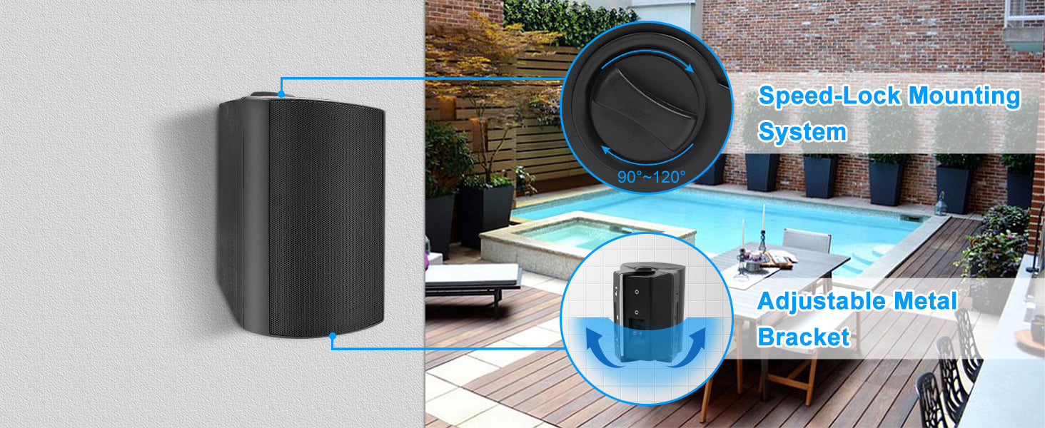 Adjustable Wall Mounts: Speed-lock swivel brackets allow flexible 90°–120° angle adjustments for precise sound direction.
