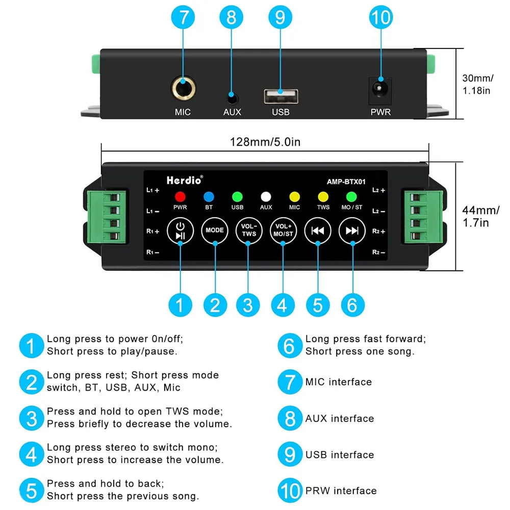 Bluetooth & AUX Support: Seamlessly stream music via Bluetooth or connect using AUX, USB, MIC IN, and TWS functions.