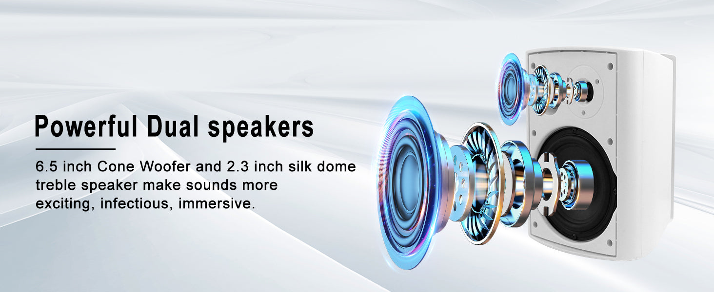 The outdoor wired speaker cabinet is made of heavy industrial material, the exterior is made of marine grade waterproof structure, protective metal grille, which can effectively protect the internal parts from damage, and can withstand different weather in any season.