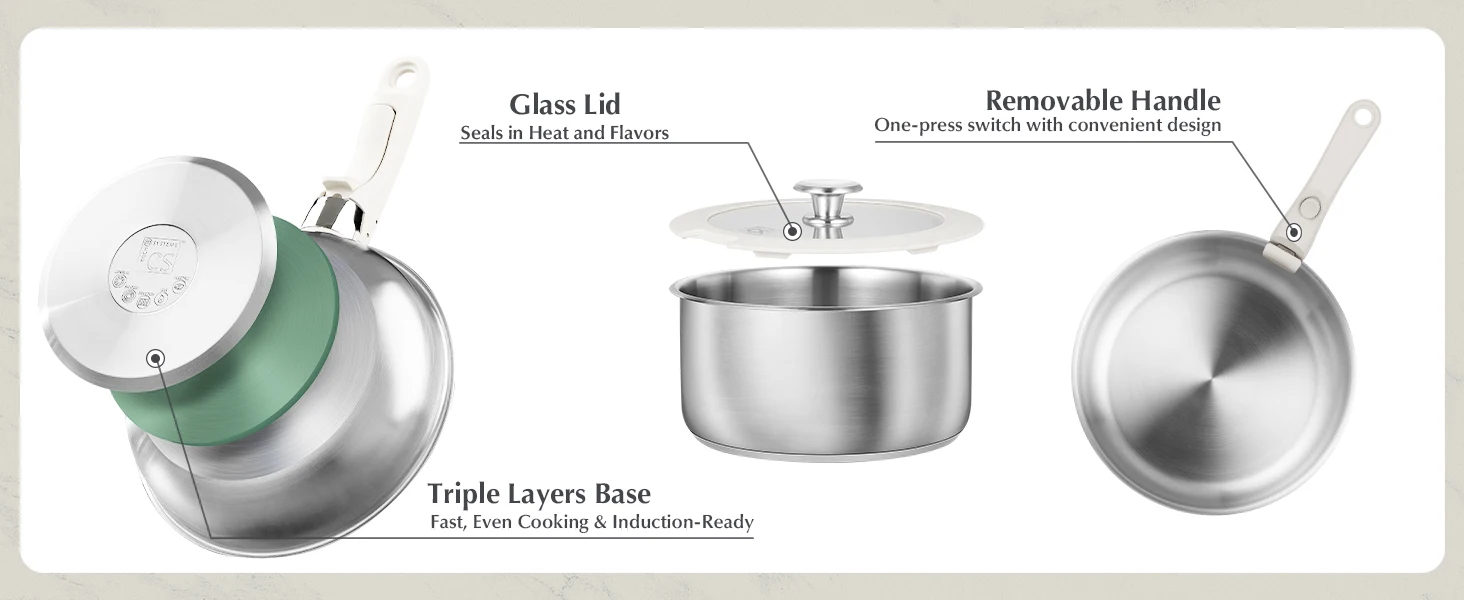 - Removable Handle Design: Switch easily between stovetop, oven, fridge, or serving on the table with one click