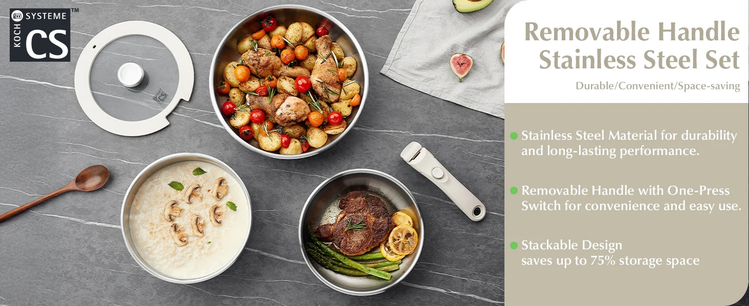 Effortless Versatility: The KOCH SYSTEME CS pots and pans set with detachable handles offers unparalleled flexibility, easily transitioning from stove to oven, grill, fridge, and even the dining table with just a simple click.Whether you're preparing meals, storing leftovers, or serving directly at the table, this set is the perfect combination of practicality and ease.