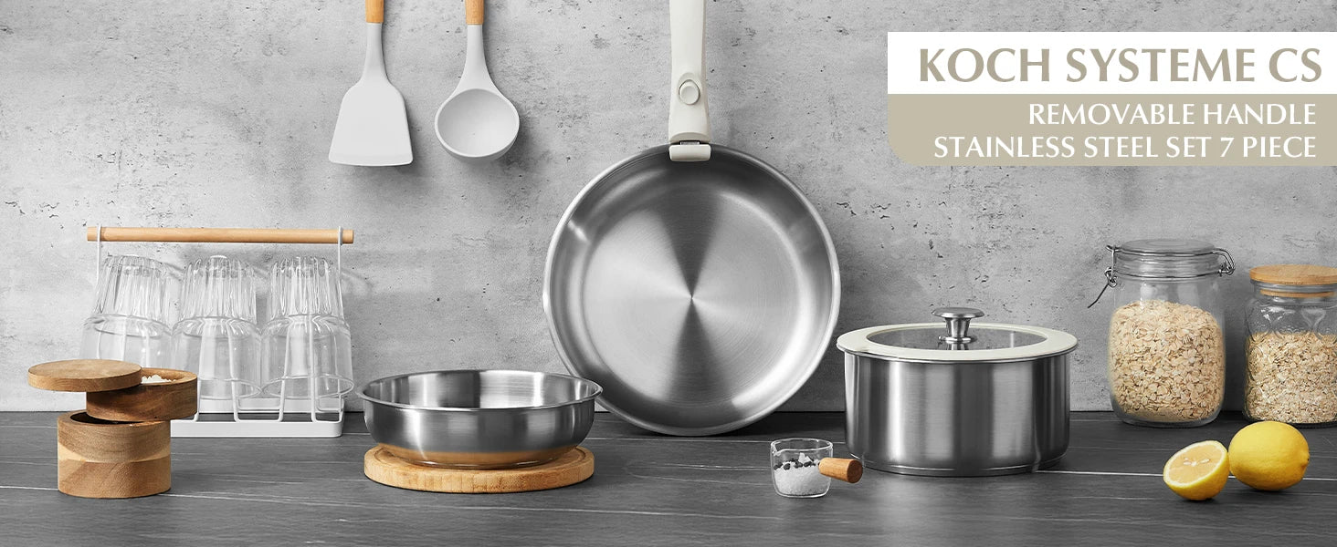 KOCH SYSTEME CS 7-Piece Stainless Steel Cookware Set with Detachable Handle – Induction Ready, Oven Safe, Space-Saving Design