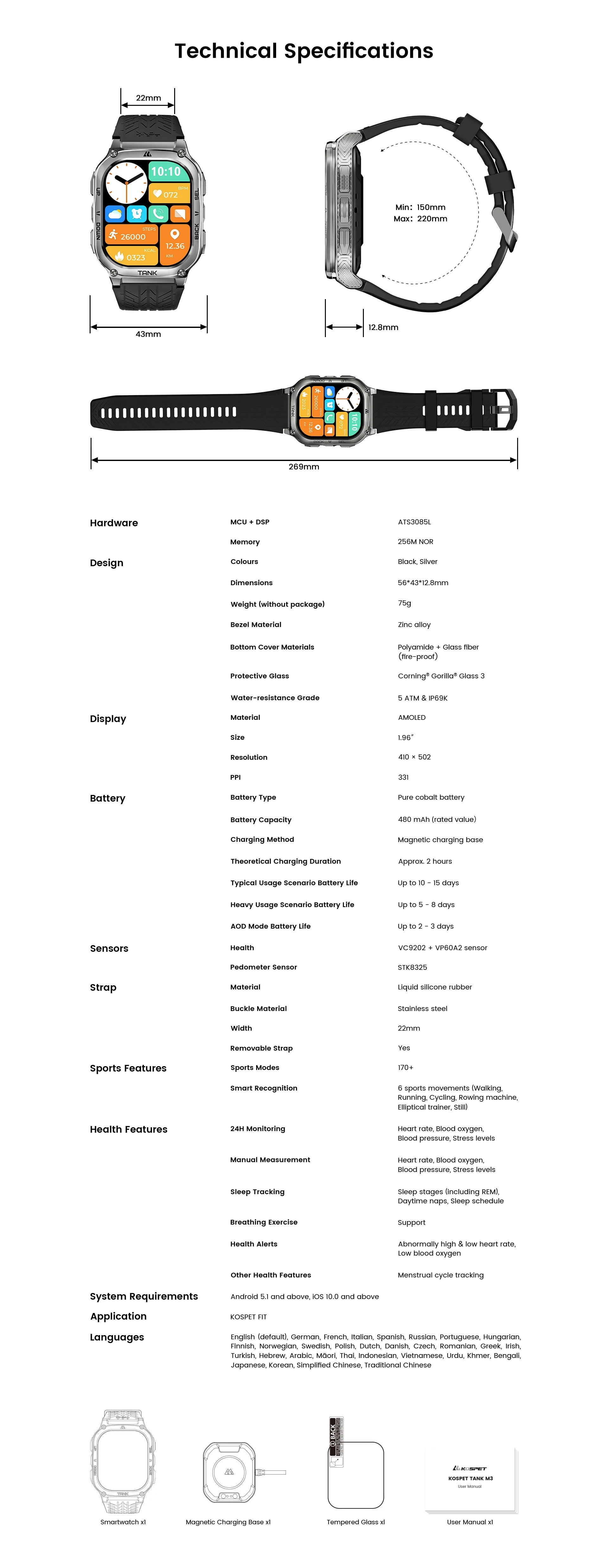 The KOSPET TANK M3 is the ultimate rugged smartwatch engineered for those who demand strength, intelligence, and style. Featuring a 1.96-inch AMOLED Always-On Display, military-grade protection, and up to 15 days of continuous use, this watch is your all-terrain companion. Whether you’re scaling mountains, training in the gym, or staying connected on the go, the TANK M3 combines precision performance with exceptional durability.