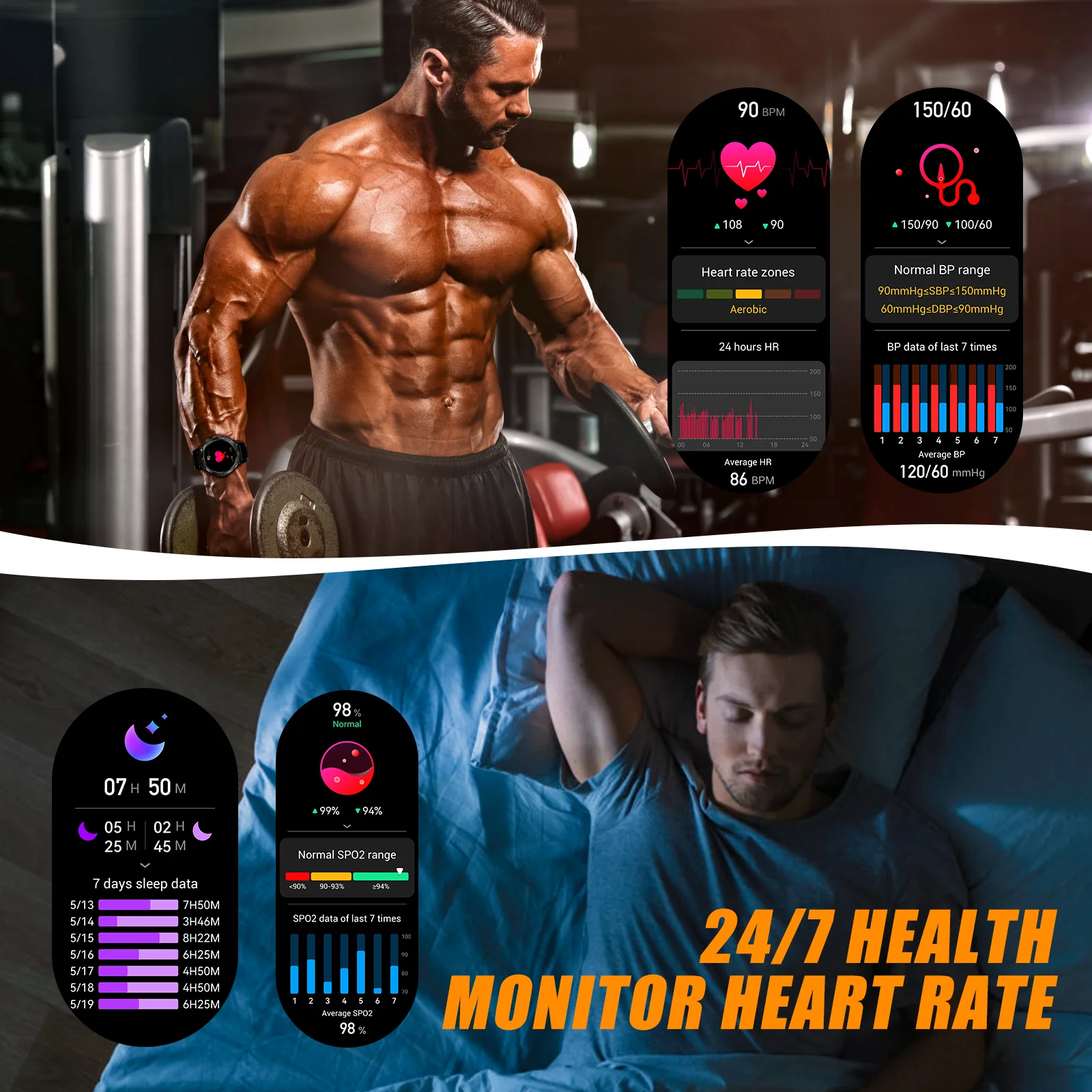 - 24/7 Health Monitoring: Track heart rate, blood pressure, blood oxygen (SpO2), sleep quality, and daily activity in real time.