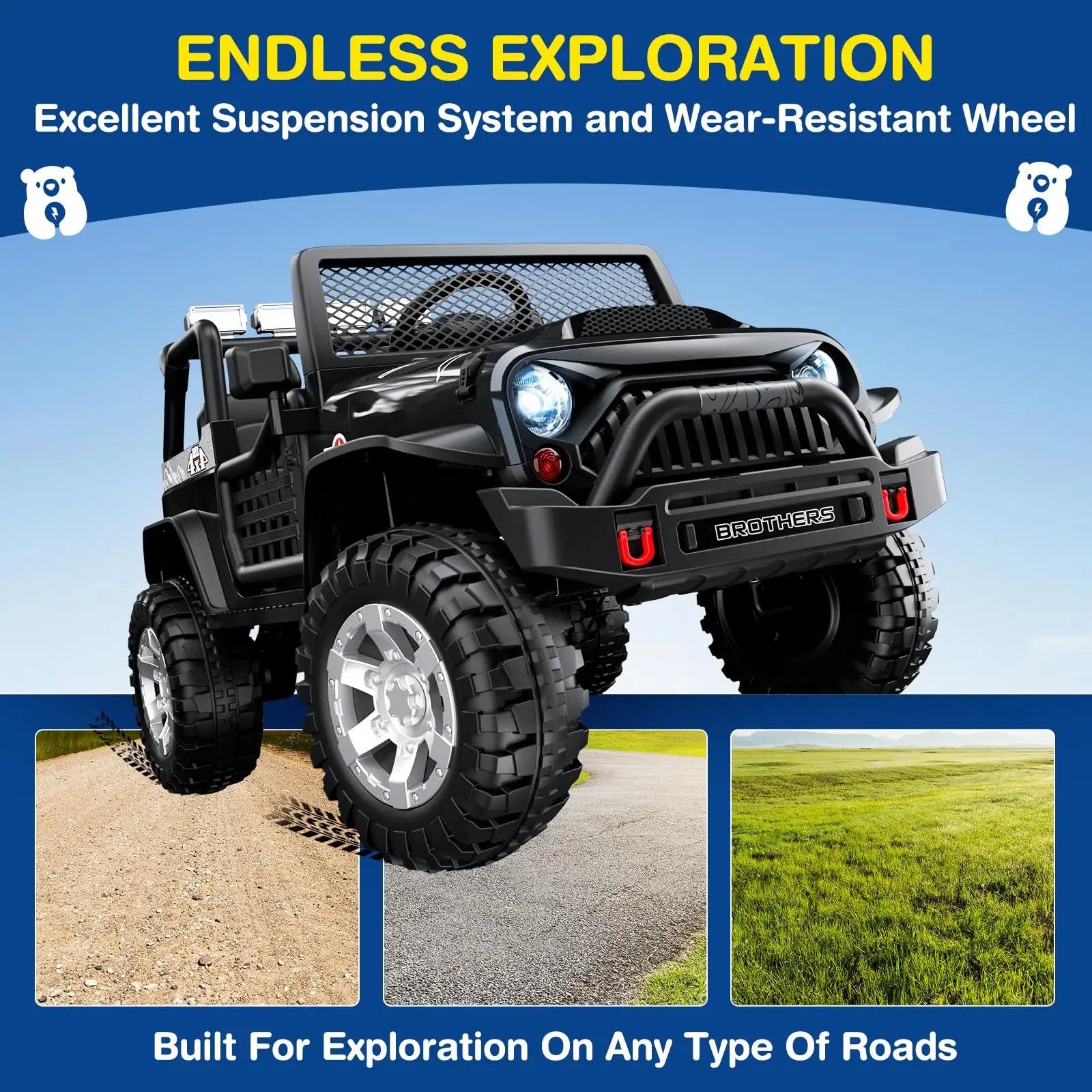 Tackle grass, dirt, and pavement with 4x4 power and rugged wheels built for adventure.