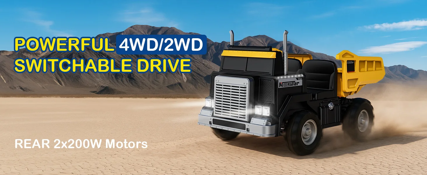 The 4WD switch is awesome! We use 2WD on sidewalks, but when we go to the park, we flip it to 4WD and it powers through the dirt like nothing. Plus, the dump feature is legit!