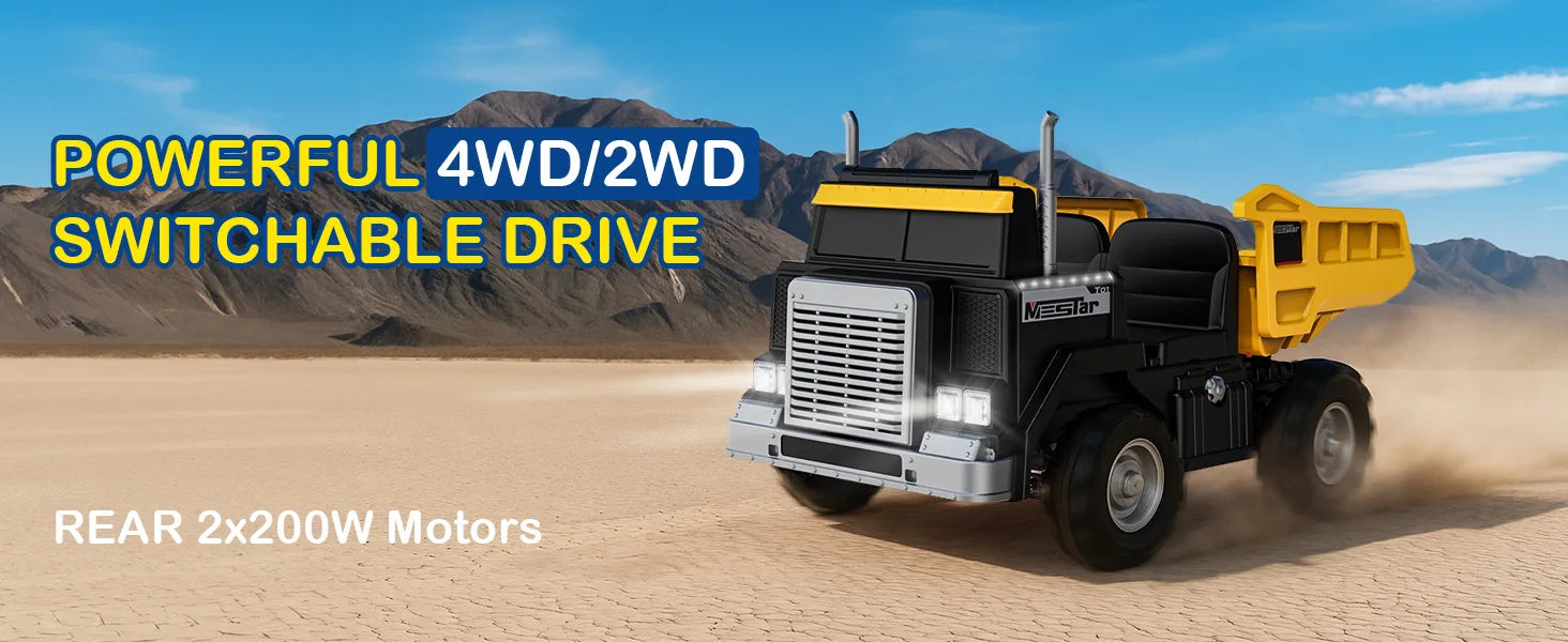 This truck is way more powerful than I expected. My 7-year-old and his little brother ride together with no problem. The dump bed works perfectly, and the 4WD makes it great on grass and gravel!