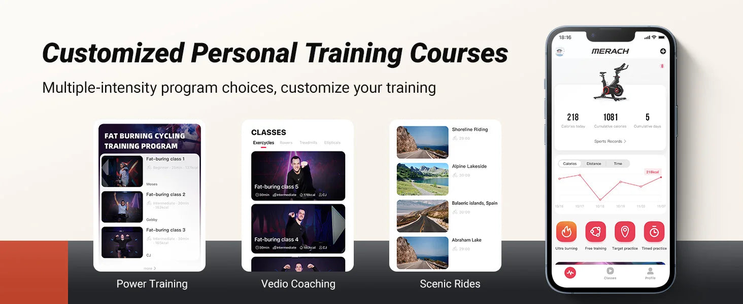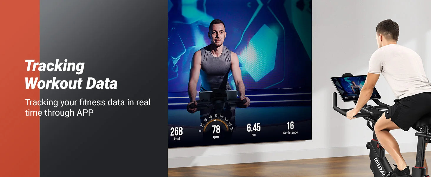 The MERACH Indoor Cycling Bike is designed to bring a smooth and immersive workout experience right into your home. Featuring a magnetic resistance system, this stationary bike delivers ultra-quiet and maintenance-free operation, making it perfect for early morning or late-night workouts. With auto-adjusting resistance, you can seamlessly transition between intensity levels, ensuring a challenging and dynamic ride. Whether you're a beginner or an advanced cyclist, the Bluetooth connectivity allows you to sync with the MERACH app, enabling real-time data tracking and interactive training sessions for a more engaging fitness journey.