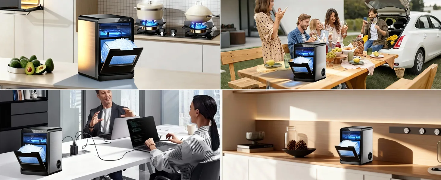 This countertop ice machine delivers premium nugget ice with fast production and simple operation. Its self-cleaning feature, smart indicators, and powerful ice output make it the perfect appliance for anyone who loves refreshing cold drinks without the hassle of traditional ice trays.