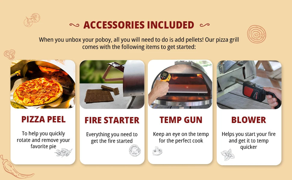 The PoBoy Oven Kit comes fully loaded with must-have accessories: a pizza peel for easy handling, a fire starter to get things going fast, a temp gun for precise cooking control, and a blower to accelerate heat buildup. From unboxing to your first slice, everything is included—just add pellets and you’re ready to cook.