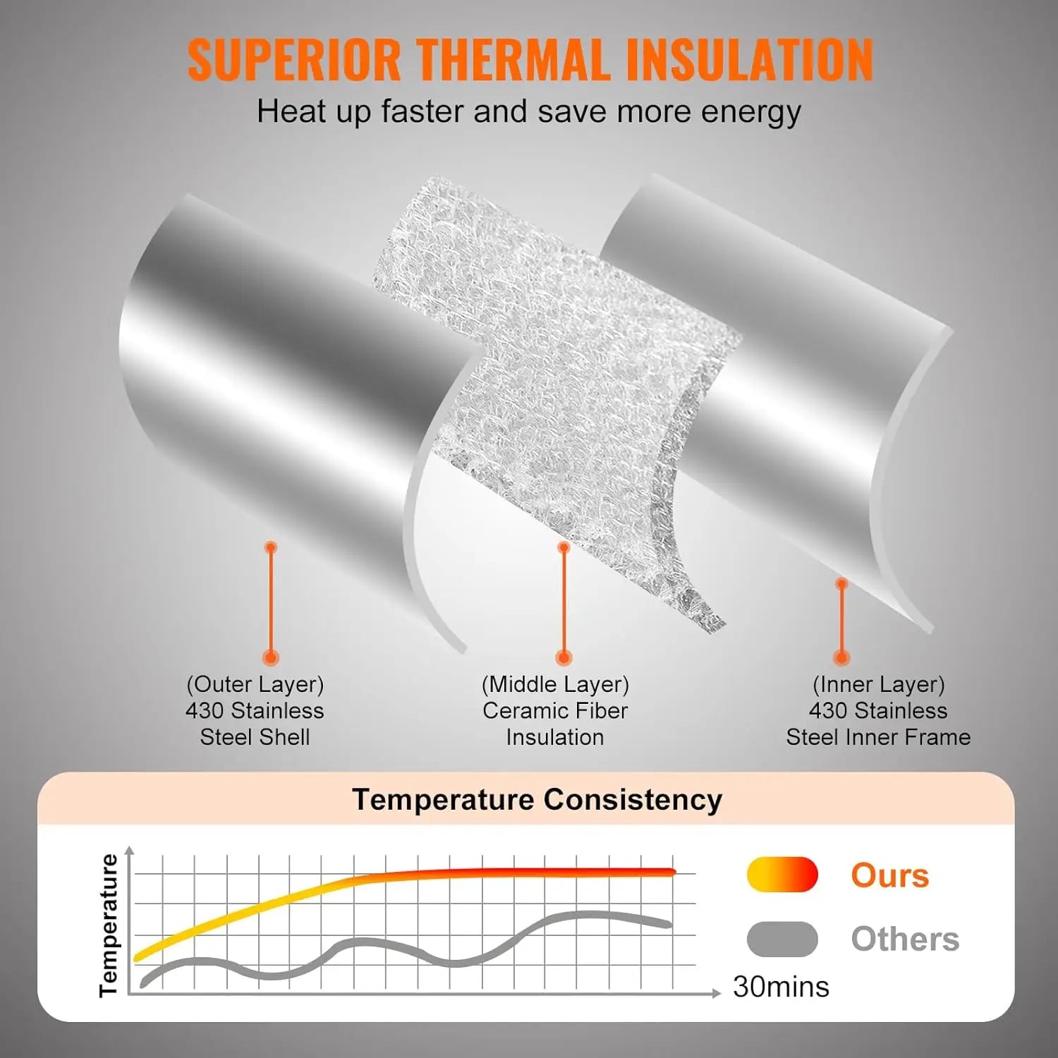 Crafted with durability in mind, the Vevor pizza oven boasts a three-layer insulated design and a rugged 430 stainless steel shell. It’s built to handle outdoor elements and frequent use while maintaining consistent cooking performance. Non-slip pads keep it steady on any surface, making it a reliable and safe addition to your outdoor kitchen.