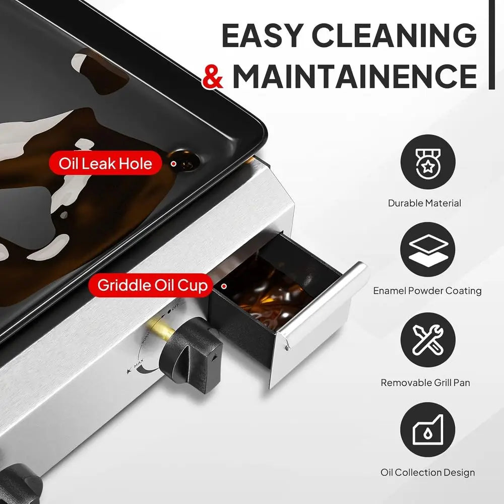 Elevate your outdoor cooking with this powerful 4-Burner Propane Griddle featuring a rolling cart, large enamel-coated grill top, and 40,000 BTU of heat. With four independently controlled burners and a flat surface spanning over 400 square inches, this portable grill delivers restaurant-style results from your backyard, patio, or campsite. Whether you're searing steaks, flipping pancakes, or grilling veggies, this propane griddle is built to keep the heat—and the flavor—consistent.