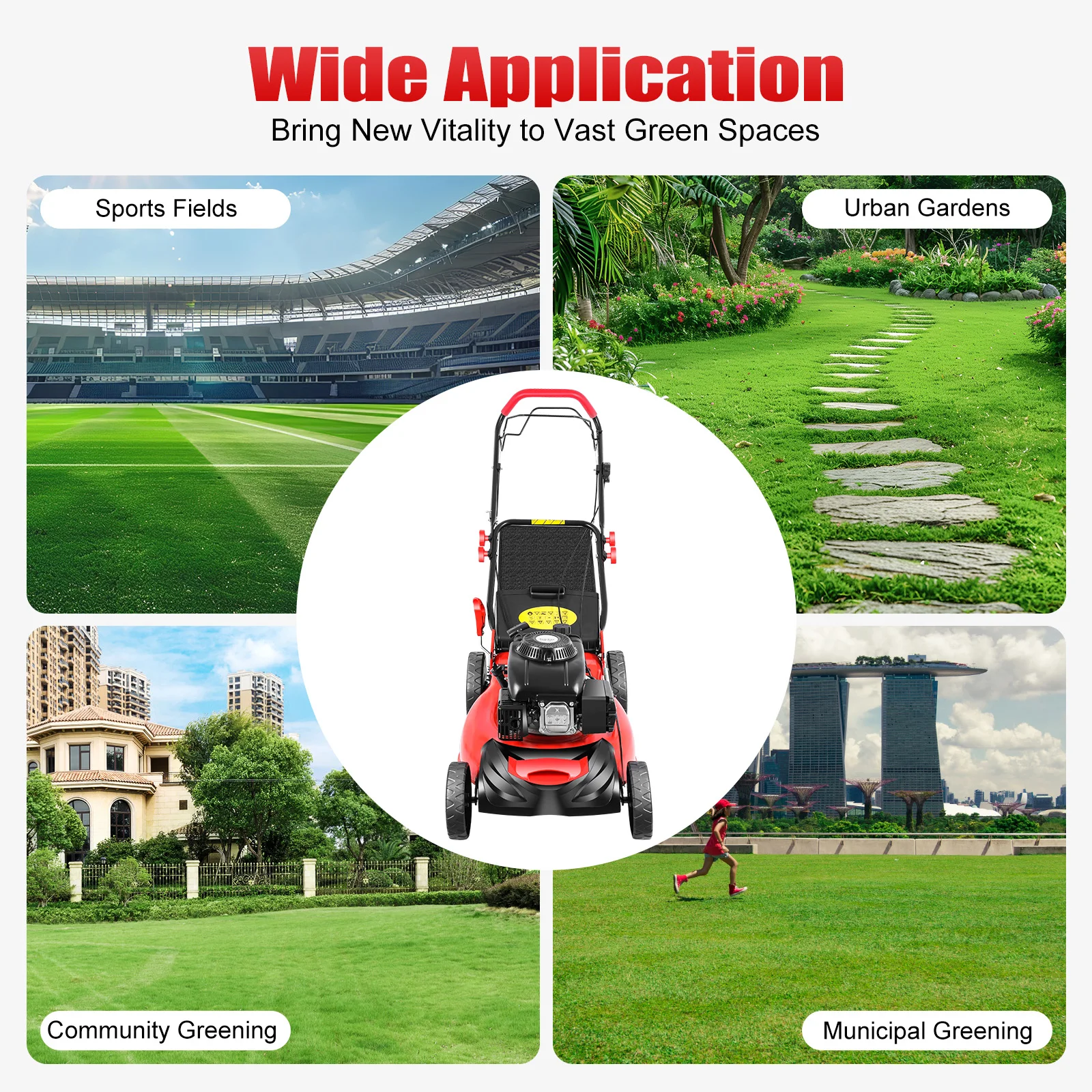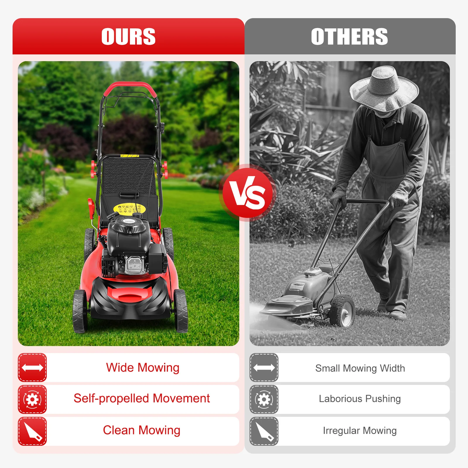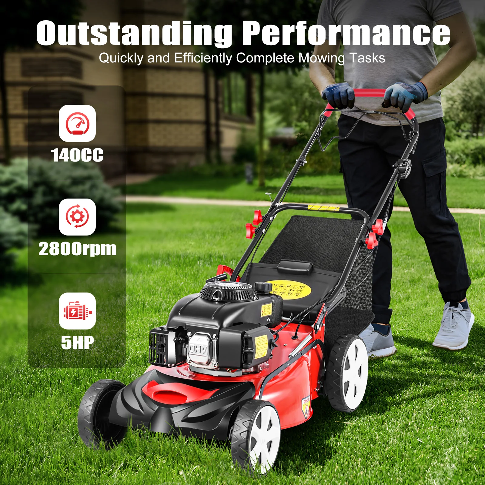 Achieve a clean, professional-looking lawn with this powerful 5HP 140CC self-propelled gas lawn mower, designed for efficiency, performance, and ease of use. Equipped with a reliable 4-stroke OHV engine, this mower delivers strong torque and consistent cutting power, making it ideal for both residential and commercial use.