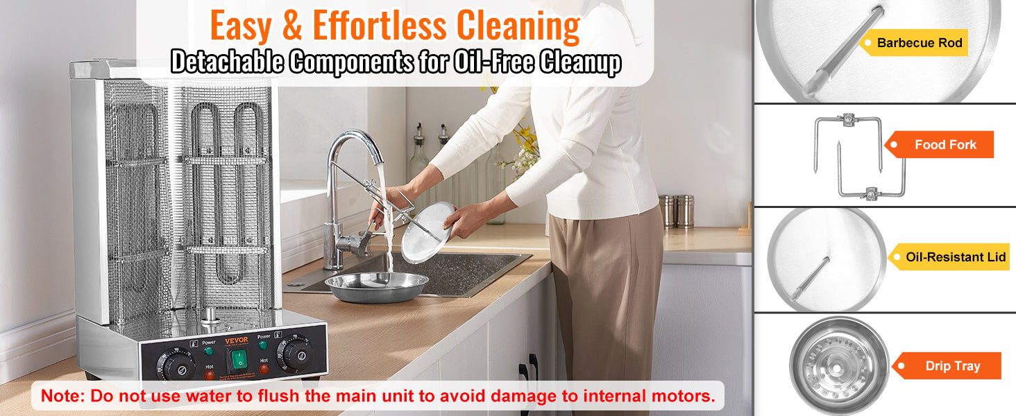 In addition to the main unit, the oil-proof cover, drip tray, and grille in the shawarma cooker can be easily removed, facilitating you to clean these ingredient-contacting parts and prolonging the service life thoroughly.