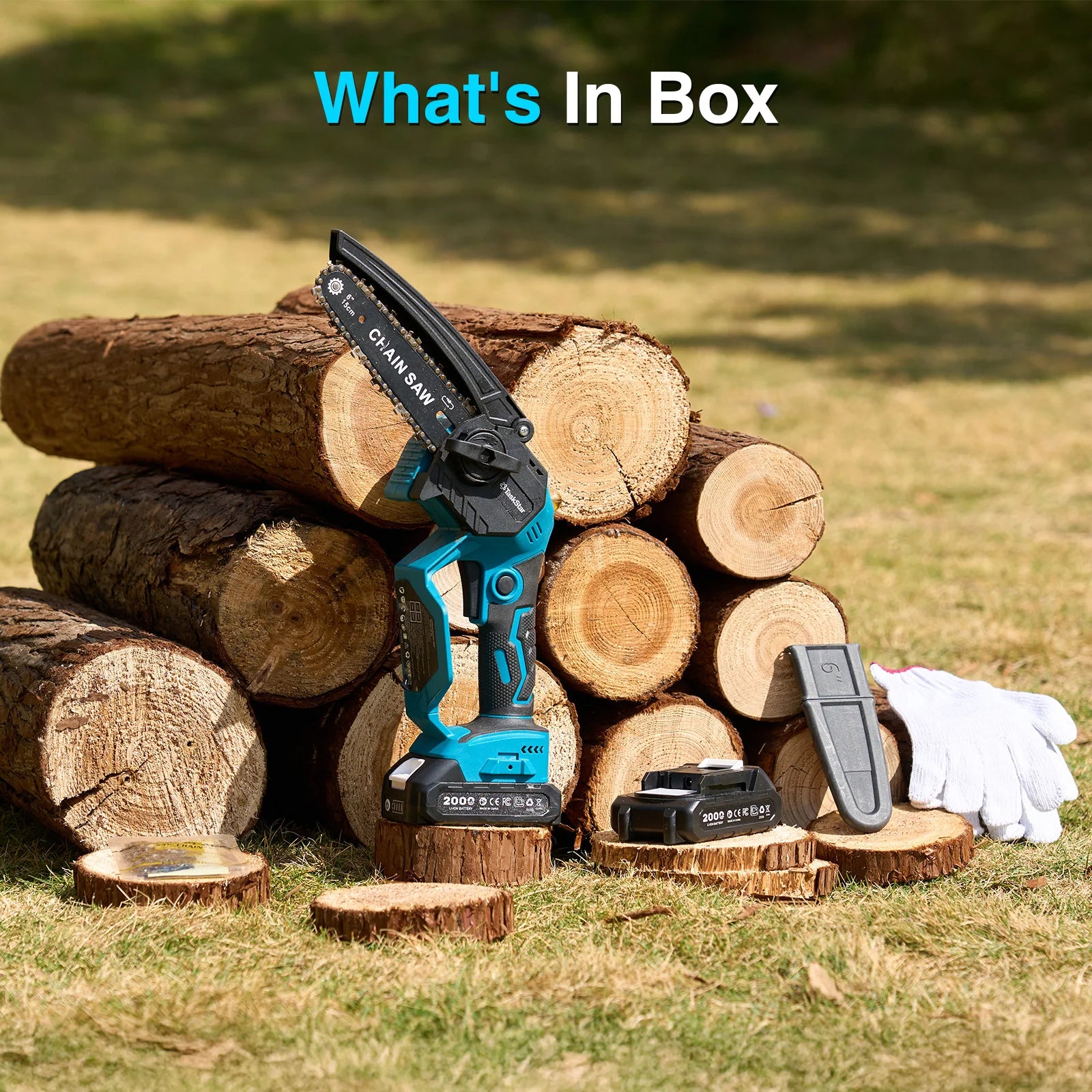 The kit comes with everything you need—two chains, gloves, goggles, oil bottle, batteries, and charger. That alone makes it worth it. It cuts through thick logs easily and feels well-balanced in the hand. For the price, this thing is a beast!