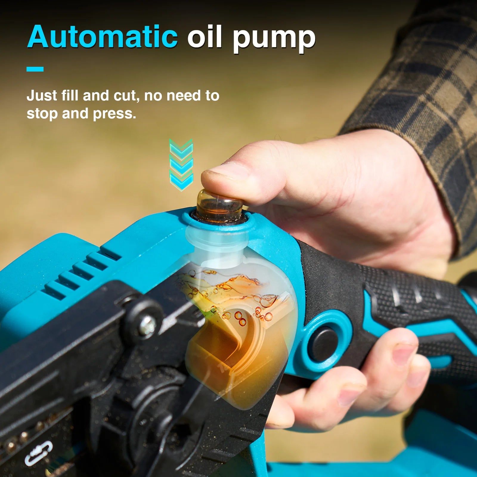 A smart auto-lubrication system adjusts oil output and keeps the chain running smoothly. The 60ml oil tank supports long sessions without interruption.