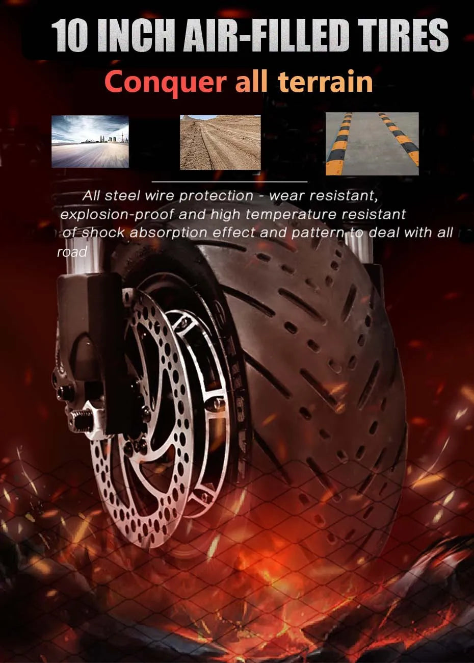 - Tires: 10-inch pneumatic vacuum tires (80/60-6), steel-wire reinforced
