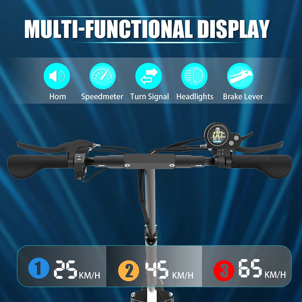 The X750 Electric Scooter delivers serious performance with a powerful 2500W brushless motor, reaching speeds of up to 65 km/h (37.5 MPH). Designed for both everyday commuting and high-speed riding, it effortlessly handles inclines up to 40°, while the reinforced aluminum alloy frame supports up to 150 kg (330 lbs). With three riding modes—Eco, Normal, and Sport—you have full control over speed and efficiency to match any road condition or personal preference.