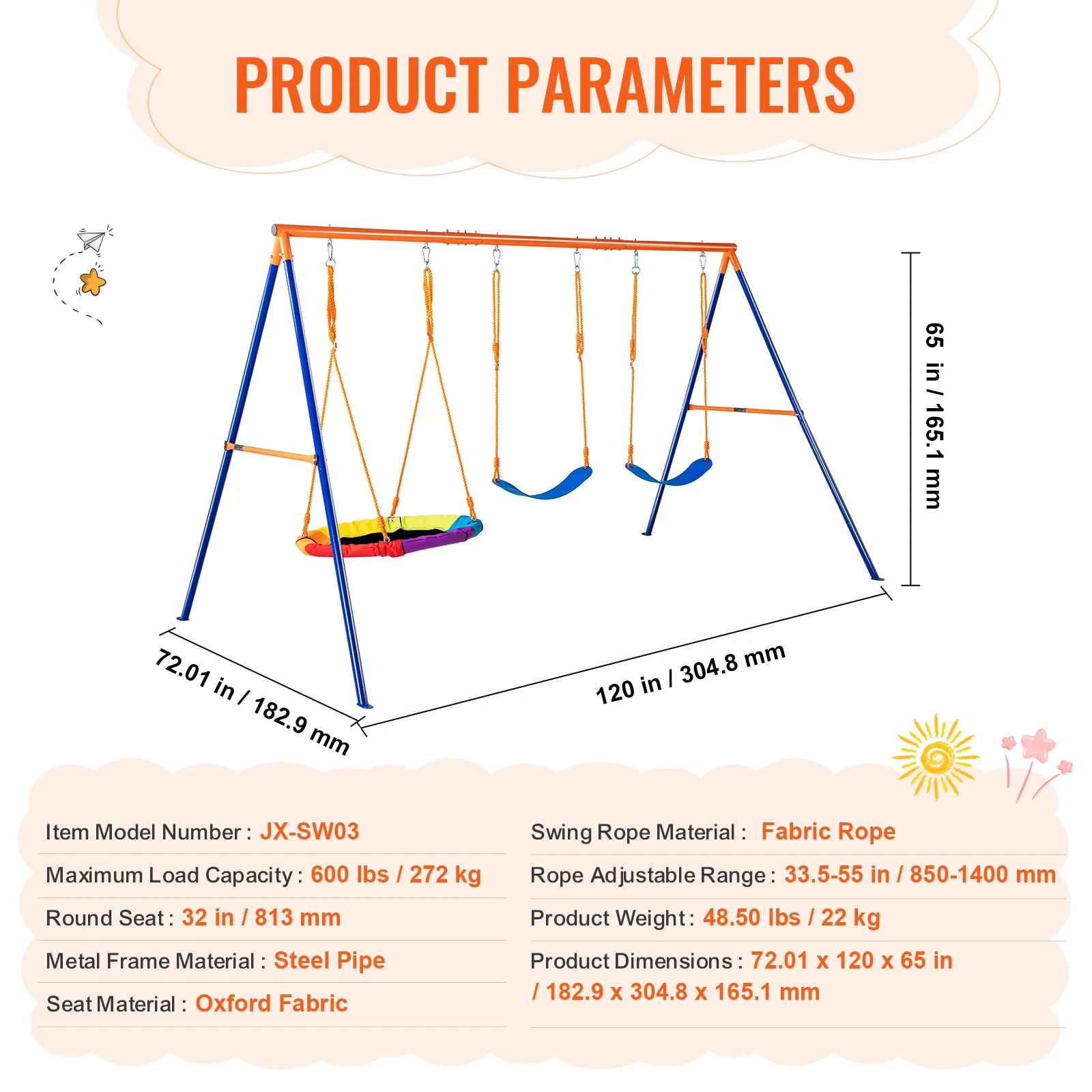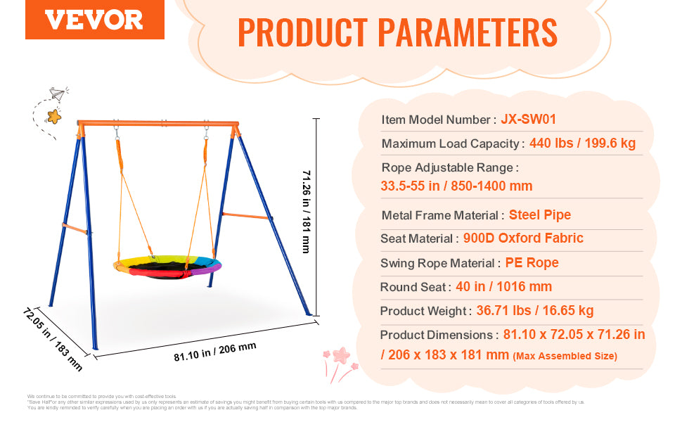 - Seat Material: Oxford fabric (saucer), plastic (belt swings)