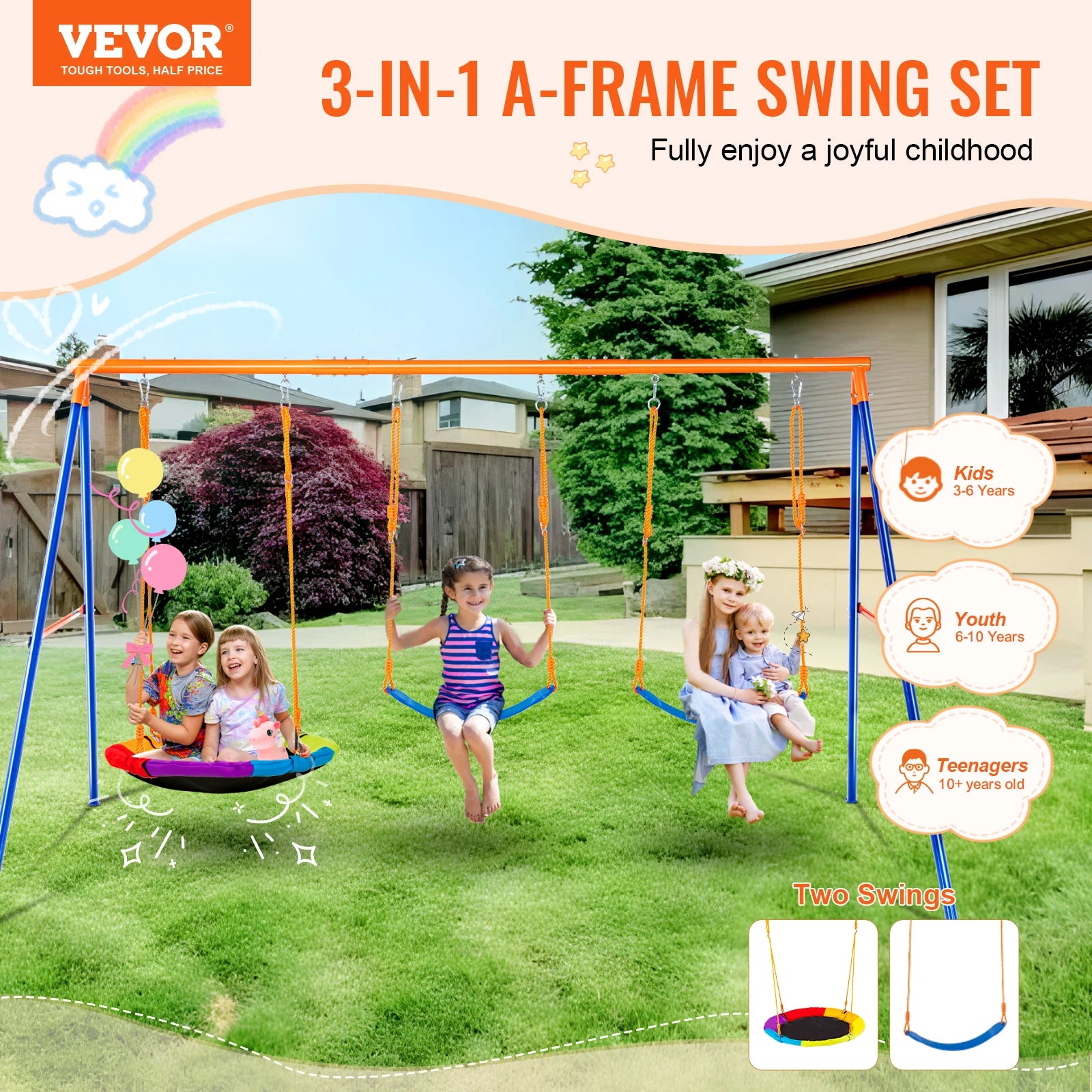Bring endless backyard fun to life with the VEVOR 3-in-1 A-Frame Swing Set — a durable, high-capacity outdoor play structure designed for kids’ safety, comfort, and joy. Engineered to hold up to 600 lbs, this swing set features one vibrant 32” saucer swing and two classic belt swings, allowing up to three children to play together. Whether it’s for birthdays, family gatherings, or everyday outdoor play, this swing set turns any yard into a mini playground.