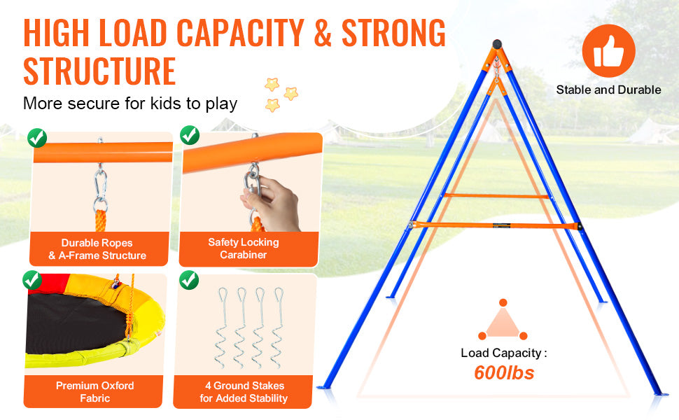 - Built for Safety and Stability – Anti-tip A-frame design, secure fasteners, and high-tensile ropes reduce sway and improve safety during vigorous swinging.